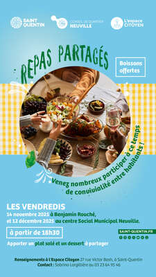 Le Conseil de Quartier vous invite à partager un moment convivial entre habitants le vendredi 14 novembre à partir de 18h30, à l’Espace Benjamin Rouché, (rue Jacques Blanchot). Puis le vendredi 12 décembre à partir de 18h30 au Centre social de Neuville (6 avenue Pierre Chocquart, à Saint-Quentin).