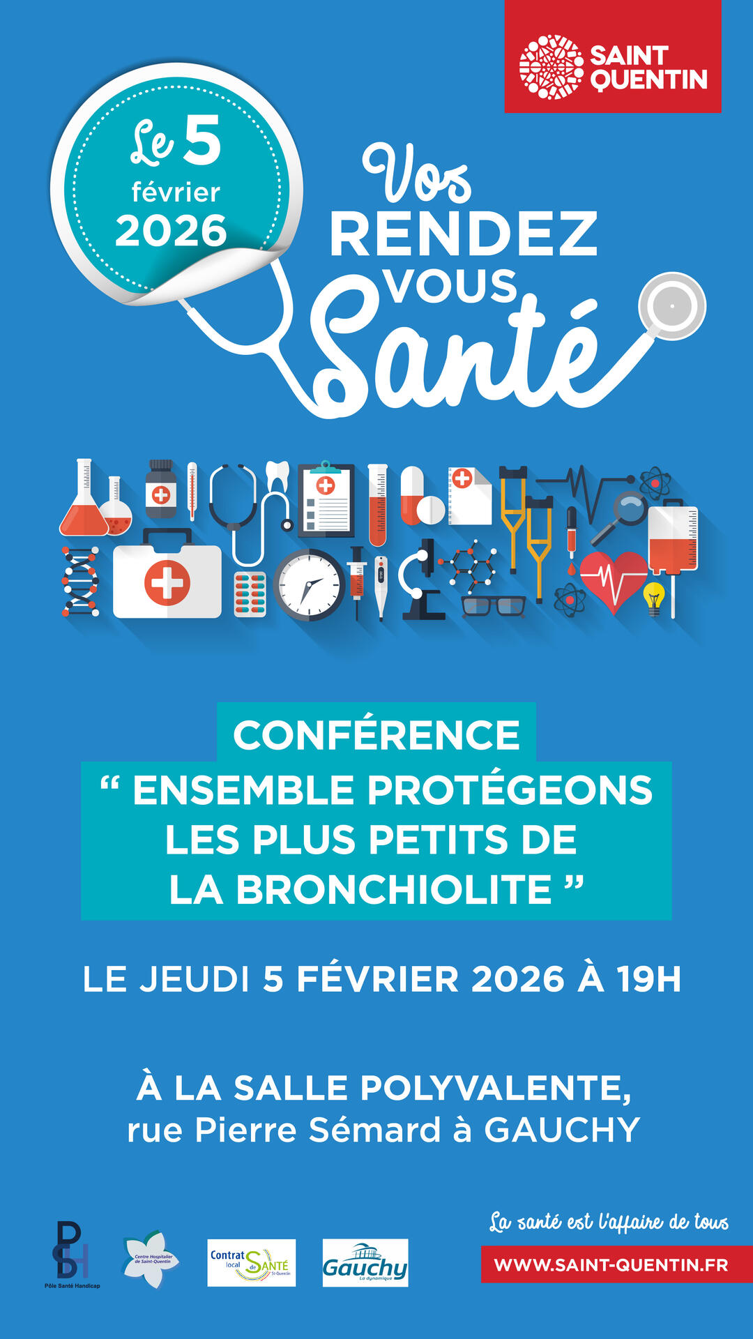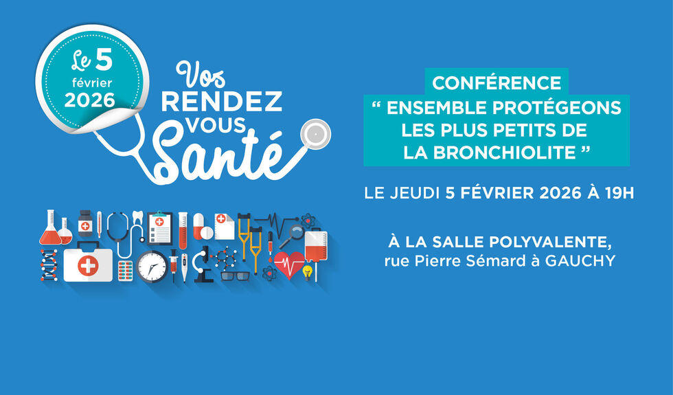 Nous vous invitons à assister à une conférence consacrée à la bronchiolite, qui se tiendra le jeudi 5 février à 19h, à la salle polyvalente de Gauchy (rue Pierre Sémard)